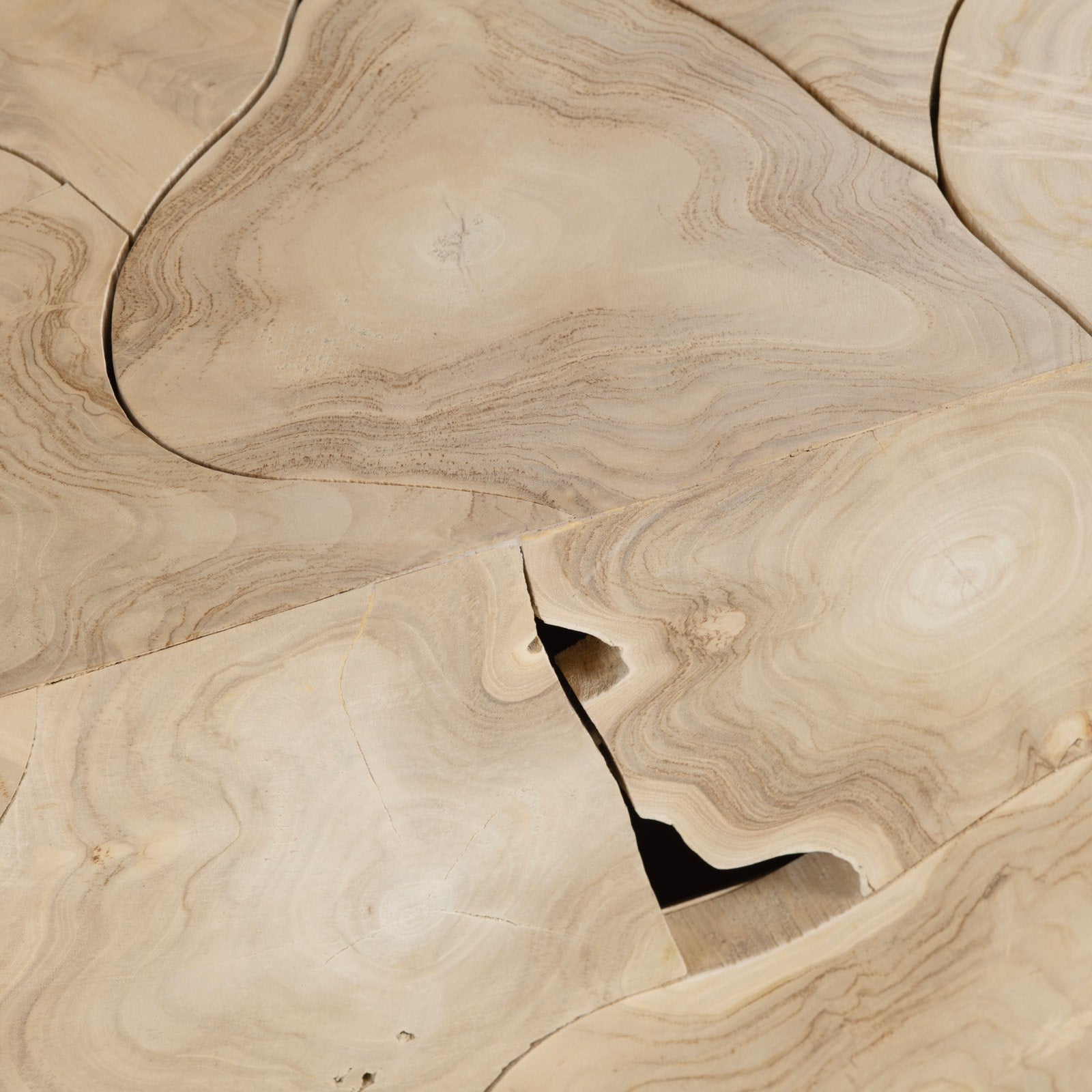 Crafted from premium teak wood, the Peace Cocktail Table transforms any living space with its captivating organic aesthetic. The distinctive rectangular silhouette features an artfully composed mosaic of wood segments, each revealing its own natural grain patterns, knots, and negative spaces that create visual intrigue and dimension. Built to withstand years of use, this piece merges practical functionality with gallery-worthy design—a conversation-starting accent that celebrates wood's raw, sculptural beauty while bringing warmth and sophistication to your home.