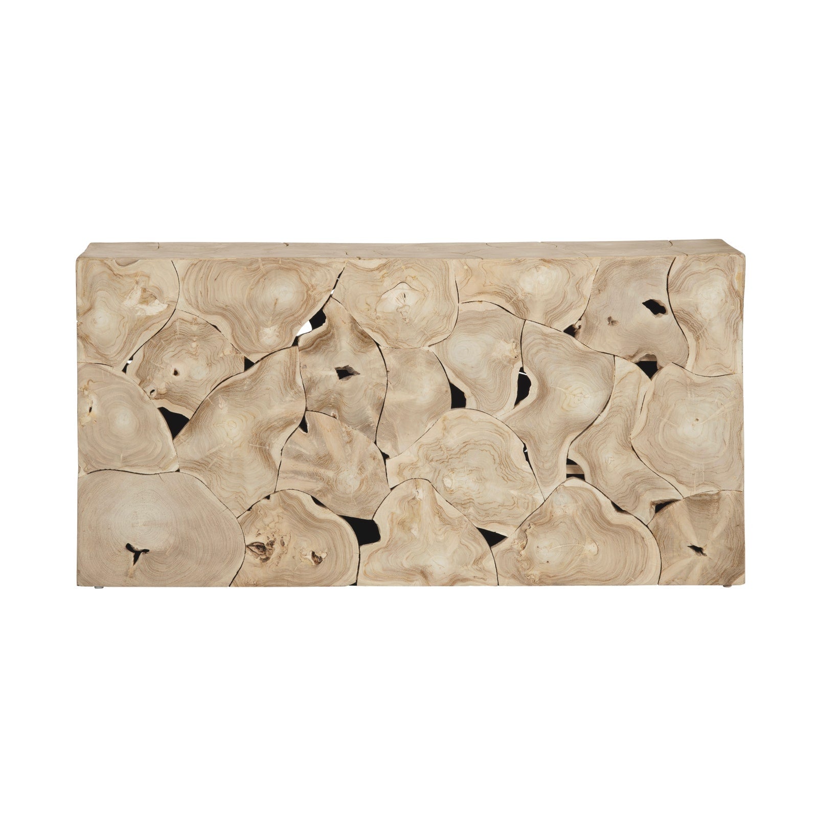 Crafted from premium teak wood, the Peace Console Table transforms any entryway or living space with its captivating organic aesthetic. The distinctive rectangular silhouette features an artfully composed mosaic of wood segments, each revealing its own natural grain patterns, knots, and negative spaces that create visual intrigue and dimension. Built to withstand years of use, this piece merges practical functionality with gallery-worthy design—a conversation-starting accent that celebrates wood's raw, sculptural beauty while bringing warmth and sophistication to your home.