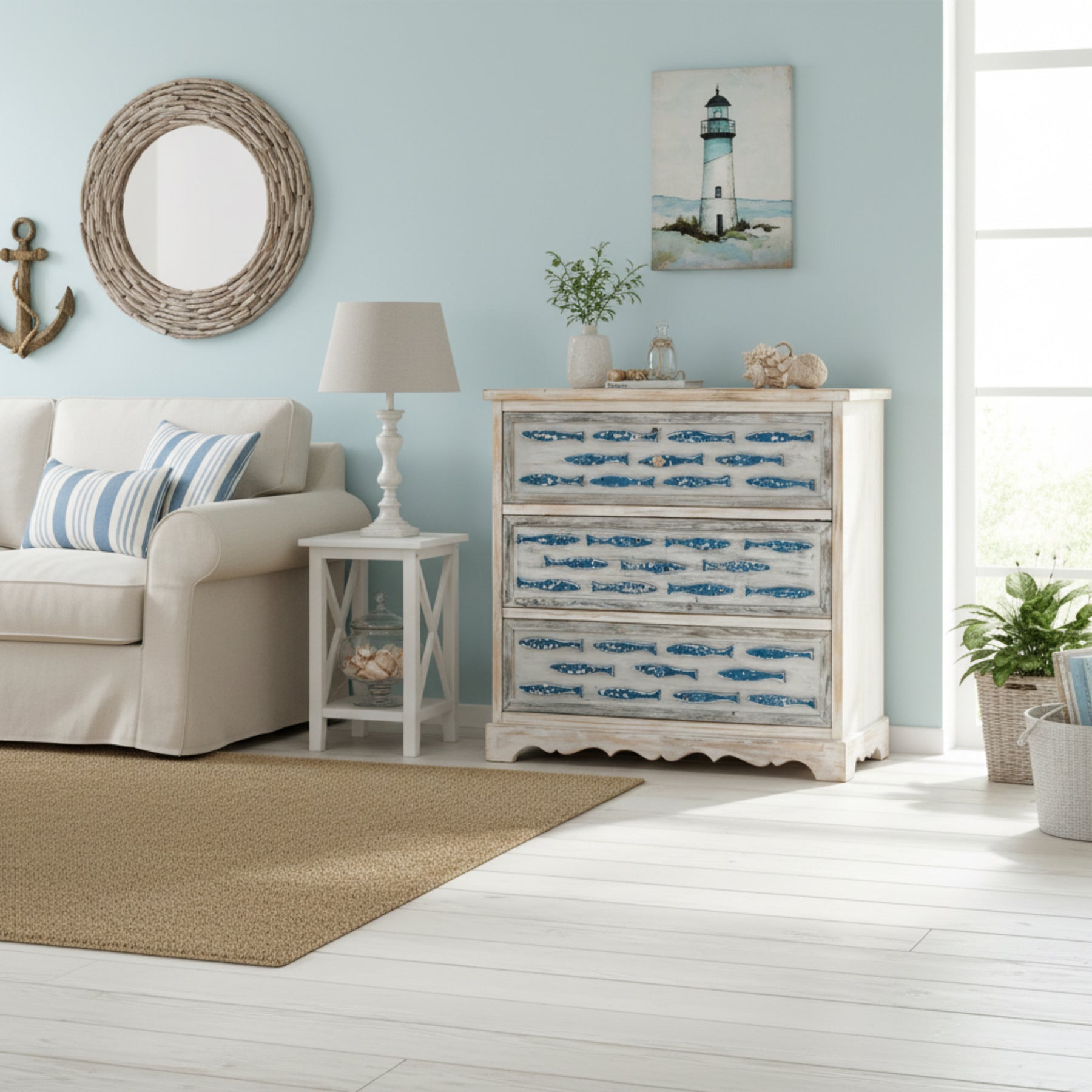 Embrace coastal living with the Downstream Chest, where nautical charm meets everyday function. This striking three-drawer piece features a crisp antique white finish that brightens any room, while hand-painted blue fish motifs on each drawer transport you straight to the seaside. Crafted from warm fir wood, it's designed to be a statement piece that sparks conversation and brings the ocean's peaceful energy into your bedroom or living space. Perfect for those who refuse to blend in.