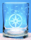 This four-piece glass set is custom designed with a ships wheel and birds over crystal clear glass.